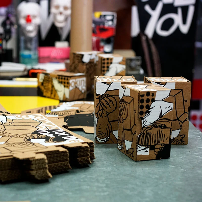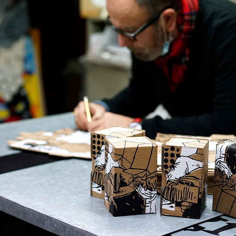 No hay dos cajas iguales, son obras singulares, únicas, numeradas y firmadas. Realizadas en serigrafía con una tirada de 99 ejemplares. El soporte de la obra es una caja de cartón que se convierte en un objeto artístico, en un objeto de colección.