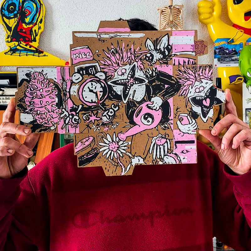 En su caso, ese trazo tan expresivo y suelto viene acompañado de un inteligente uso del color (un verde esmeralda y un rosa chillón) intensificando esa tensión entre la “Happycracia” y la ansiedad que nos produce ver a este personaje totalmente desquiciado, abarrotado de quehaceres, preocupaciones y en1dades que lo rodean. Tanto es así que nuestro protagonista parece sufrir una bilocación, en la que le vemos regar sus girasoles, pero también atender a alguna alarma, post de Instagram y/o mensaje del trabajo en su smartphone. Esta sensación de simultaneidad es producto de la hiper aceleración e hiper produc1vidad que asumimos en nuestro día a día. Incapaces de reconciliar el espacio y el 1empo vivimos en un presente constante, similar al del conejo blanco de Lewis Carroll. Nos decimos: “¡Llego tarde, llego tarde!”. Sí, pero ¿A dónde? “Allá atrás, donde debía estar hace rato”…